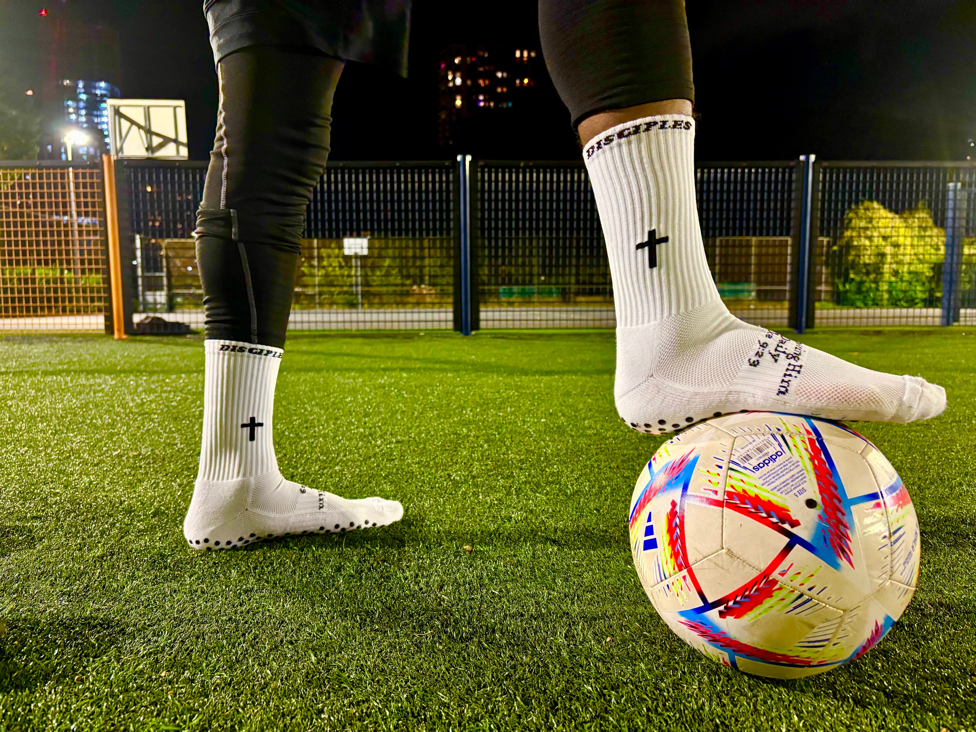 Disciples create premium grip socks and lightweight shinpads the deliver top performance while sharing a bold message of Luke 9:23